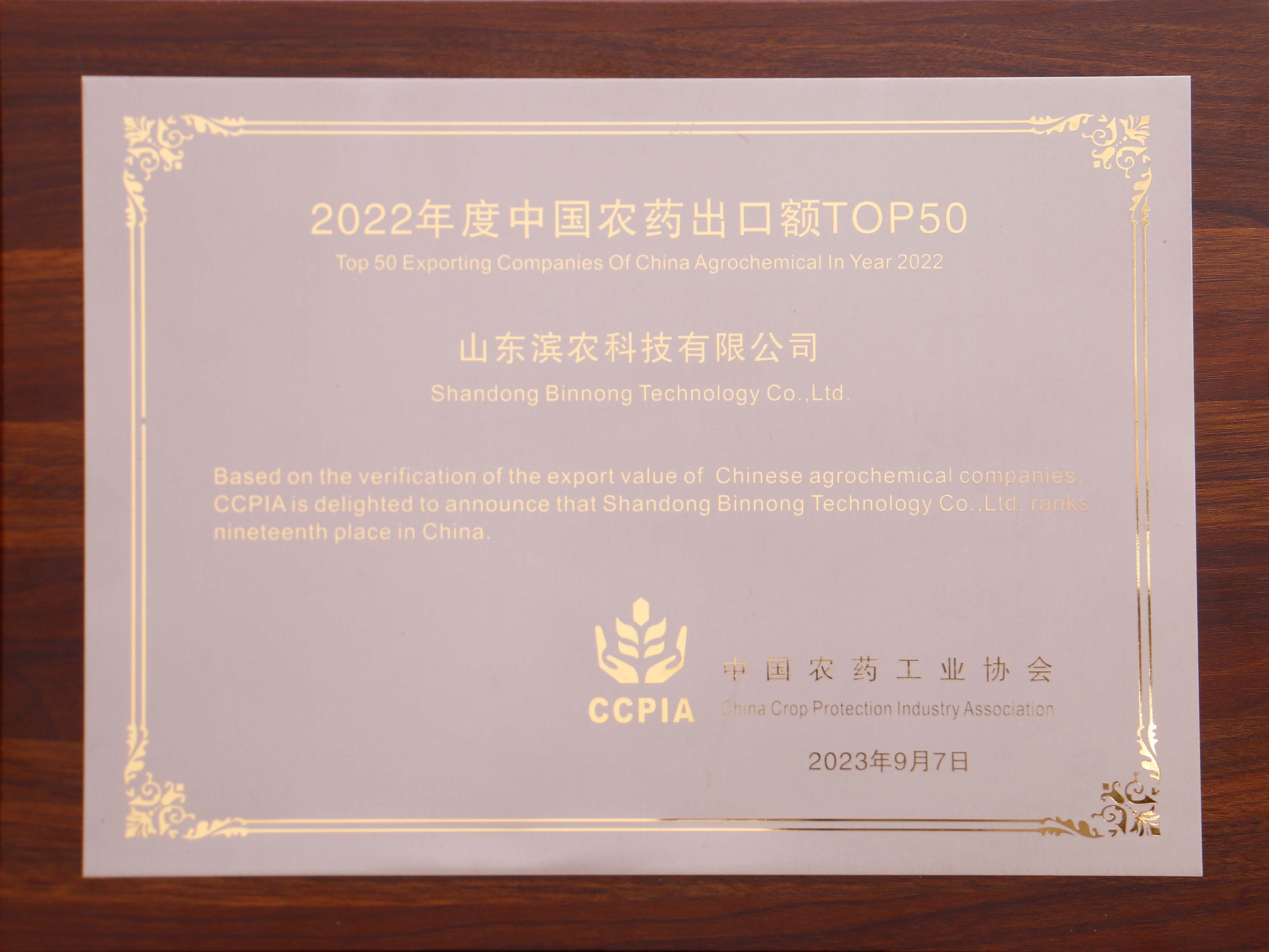 9月7日,在“第十屆中國植物保護產品國際貿易發展論壇”上,中國農藥工業協會國際貿易委員會發布了2022年度“中國農藥出口額Top 50”。濱農科技榮獲2022年度“中國農藥出口額Top 50”第十九名。