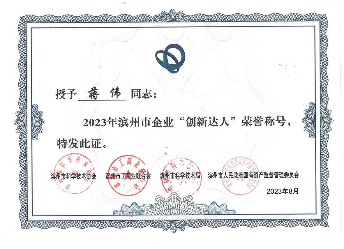 • ■2023-10-09 我公司蔣偉榮獲2023年 濱州市企業“創新達人”榮譽稱號