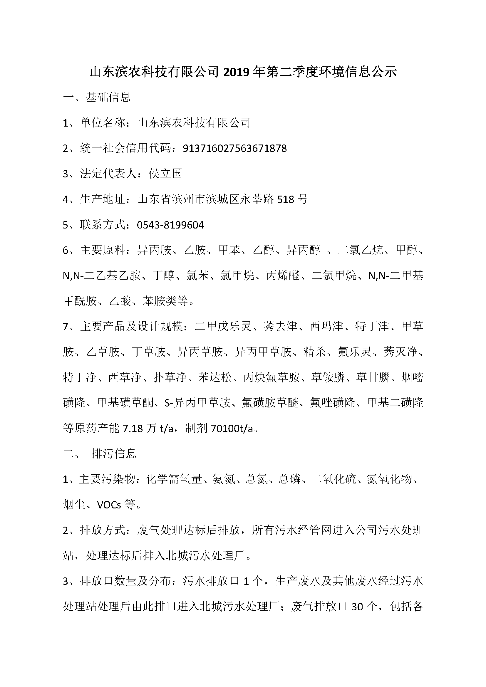 山東濱農科技有限公司2019年第二季度環境信息公示