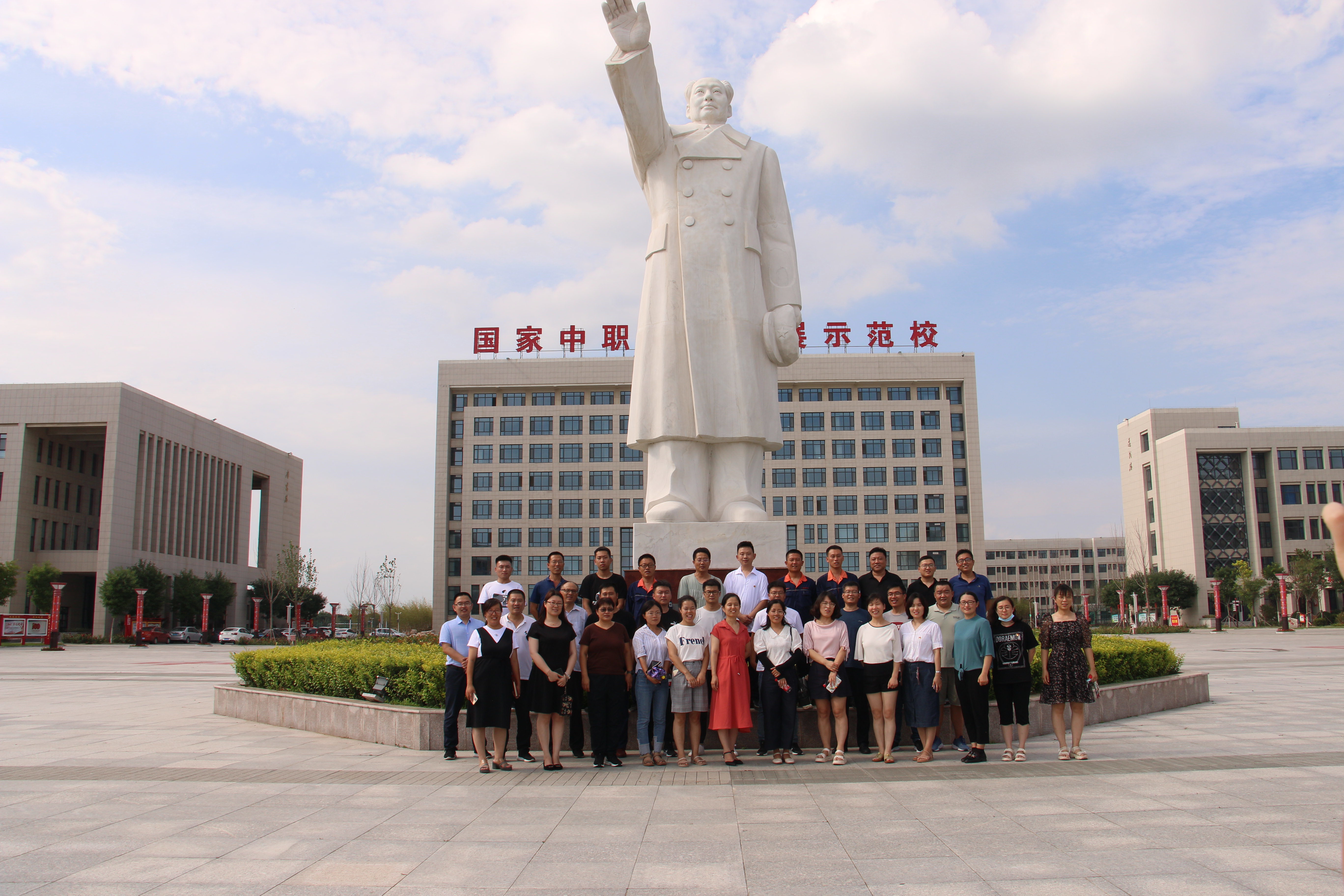懷著對革命前輩的崇敬之情,黨員一行在渤海革命老區紅色教育基地毛岳軍科長的帶領講解下參觀了韶山樓紅色育人展廳、紅色連廊、3D打印實訓室、渤海革命老區展廳及古田樓學生公寓、南昌樓紅色展藏館。最后,全體參會黨員在在東方紅廣場同毛主席雕像進行了合影留念。