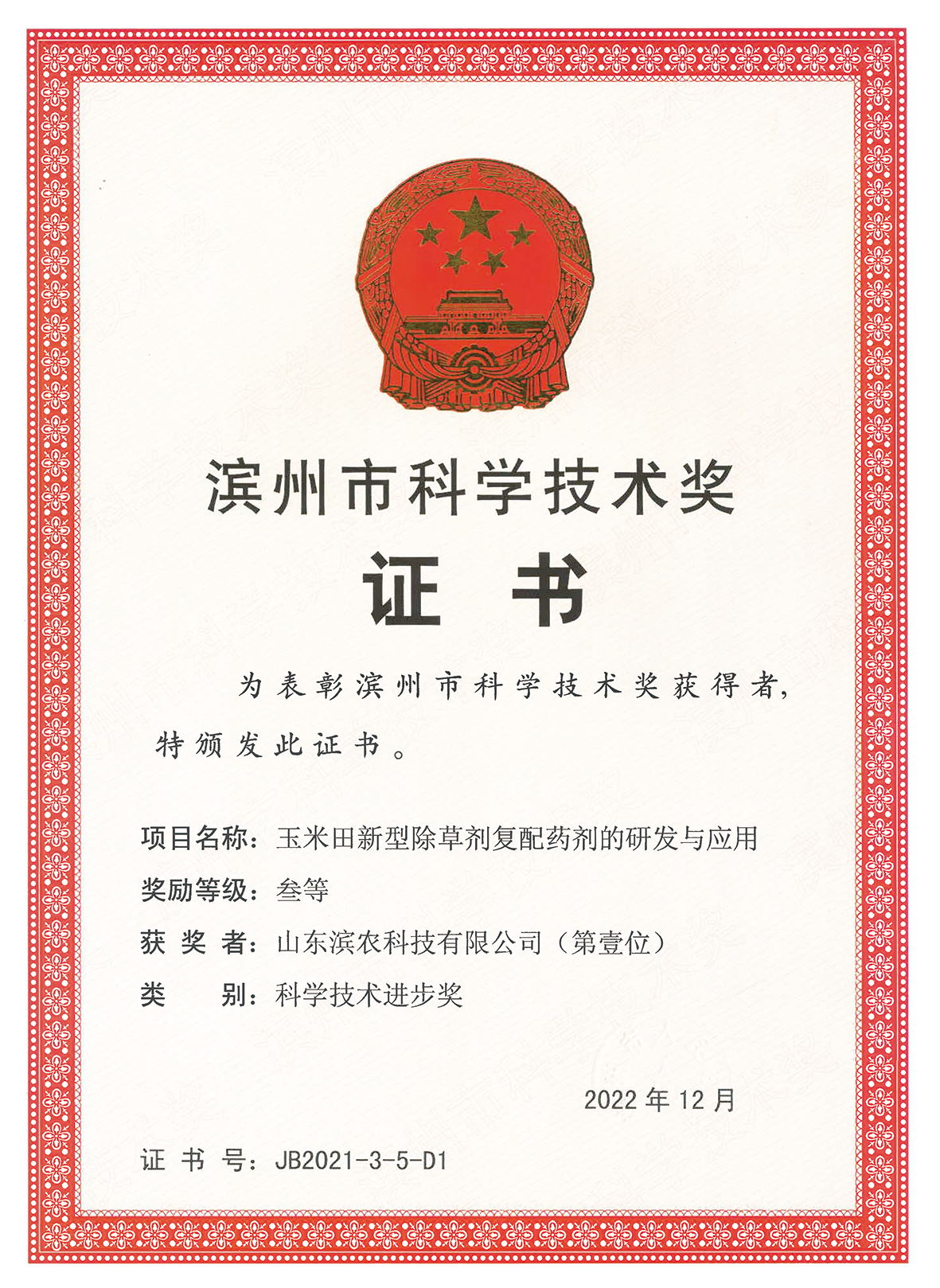 我公司一項目榮獲濱州市科學(xué)技術(shù)進(jìn)步獎三等獎發(fā)布時間:2023-02-10 09:21為全面落實黨的二十大精神,加快科技自立自強(qiáng),深入實施科教興濱,科教興企,創(chuàng)新驅(qū)動發(fā)展戰(zhàn)略,我公司聯(lián)合濱州市農(nóng)業(yè)技術(shù)推廣技術(shù)中心以及濱州市農(nóng)業(yè)綜合執(zhí)法支隊申報的“玉米田新型除草劑復(fù)配藥劑的研發(fā)與應(yīng)用”項目,根據(jù)《濱州市科學(xué)技術(shù)獎勵辦法》規(guī)定,經(jīng)過初評、市科學(xué)技術(shù)評審委員會評審、市科技局審核,該項目榮獲濱州市科學(xué)技術(shù)進(jìn)步獎三等獎。 ![]() |