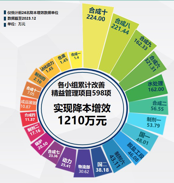 全年共計87個車間(部門)參與精益改善,濱州與沾化基地共評價改善項目598項,降本增效約1200余萬元。甘肅基地提交改善項目158項,降本增效551萬元。公司為鼓勵各系統參與改善,促使產品增值并快速實現產品價值、組織增效,共發放激勵基金58330元。各分管副總分別就2024年卓越推進工作做了詳細要求,要求各改善團隊展開改善項目盤點工作,借鑒優秀,對標持續改善,筑牢基礎管理工作。持續提質提效,降工降費,節能減排;持續三化融合,使人機配合更高效,精益數字高賦能。細化績效指標分解工作,將改善項目與部門績效、公司經營目標有效銜接。結合全年各改善團隊參與情況及改善績效,以及各系統分管領導評定,公司評選出四個年度優秀精益改善團隊:制劑一車間、國一車間、合成七車間、危廢處理車間。