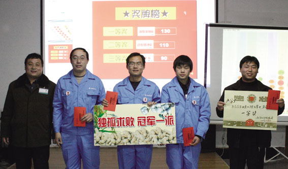 最后,經過激烈火爆的比拼,五分廠獨孤求敗隊以130分摘得冠軍,科室二組封殺劈凈隊、二分廠飛翼隊分獲二等獎、三等獎。首屆企業文化擂臺賽在一片歡騰中圓滿結束,但是各選手仍意猶未盡,期待在下次擂臺賽上再顯身手。