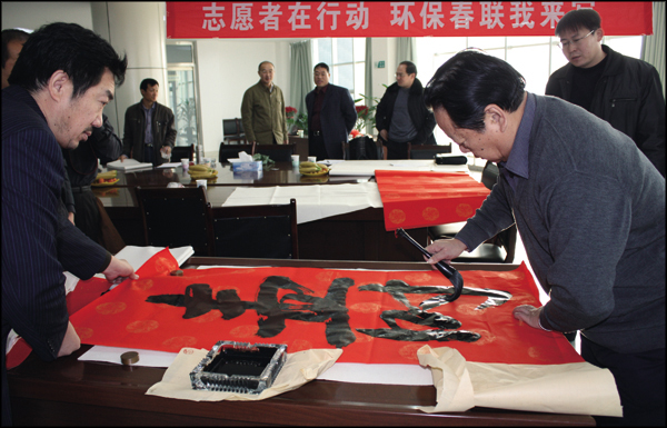 1月29日上午,由濱州市環(huán)保局、環(huán)保協(xié)會聯合舉辦,我公司冠名贊助的環(huán)保春聯有獎征集暨現場書寫在我銷售公司三樓會議室隆重開展。濱州市環(huán)保協(xié)會邀請我市書法協(xié)會主席孫樹勛先生等八位書法家,義務參加“志愿者在行動,環(huán)保春聯我來寫”活動,現場潑墨揮毫,書寫環(huán)保春聯一百多幅,墨香氤氳的和諧場面,暗合了“青山環(huán)北郭,綠水繞東城”的美好和諧意境。