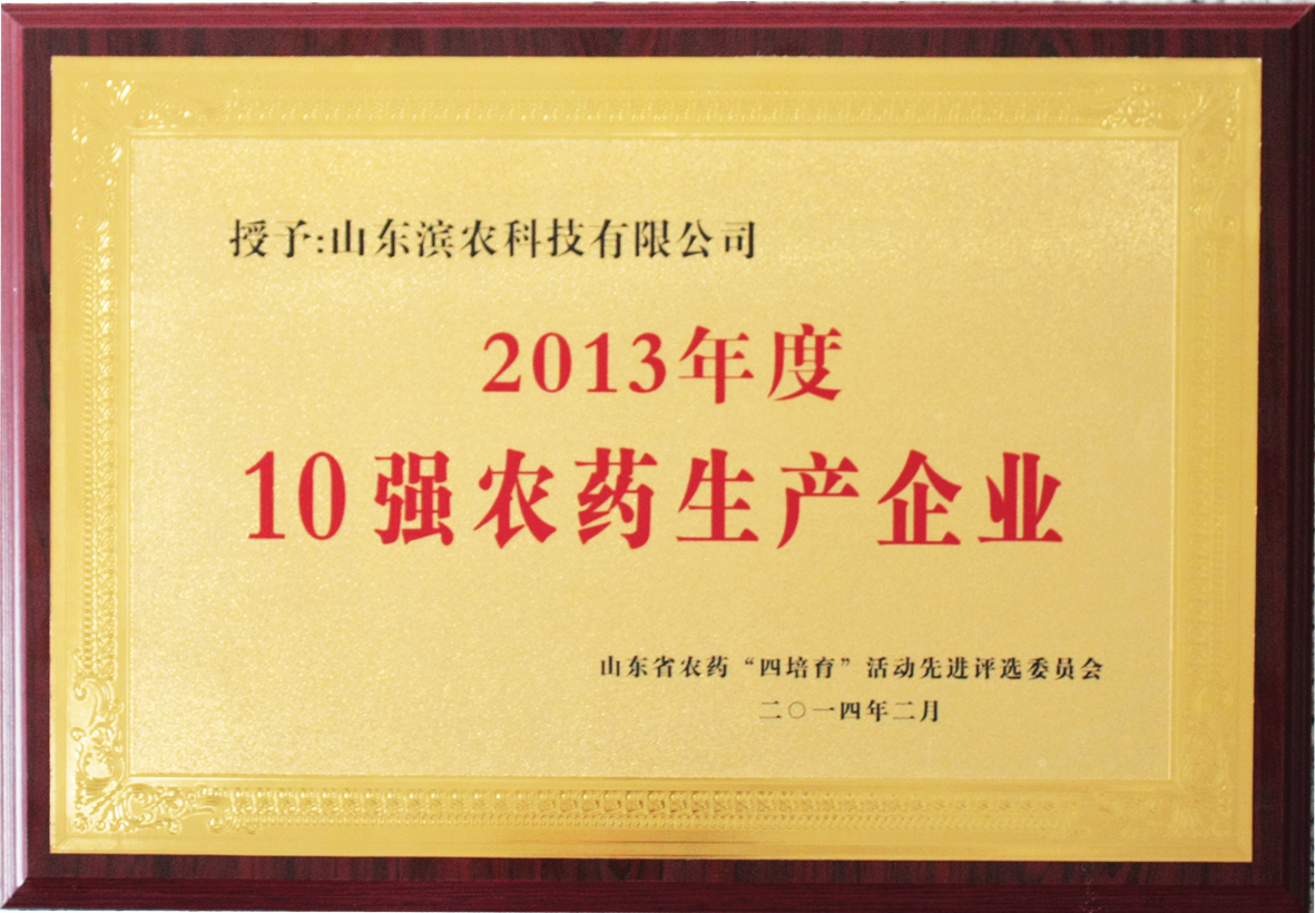 3月13日,山東省農藥管理工作年會在濟南召開,公司董事長黃延昌應邀參會。會議公布了山東省農業廳組織的“四培育”活動先進單位評選結果:濱農科技獲得十強農藥生產企業第一名。這是我公司繼2010年、2012年獲得第一名之后再次榮獲第一名。這一榮譽的取得,不僅證明了我公司在山東農藥行業所具有的地位和實力,證明了公司產品在廣大用戶心中的美譽度,同時也將鼓勵我公司繼續腳踏實地,以更加優秀的產品、更加優異的服務來回報社會。