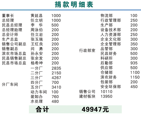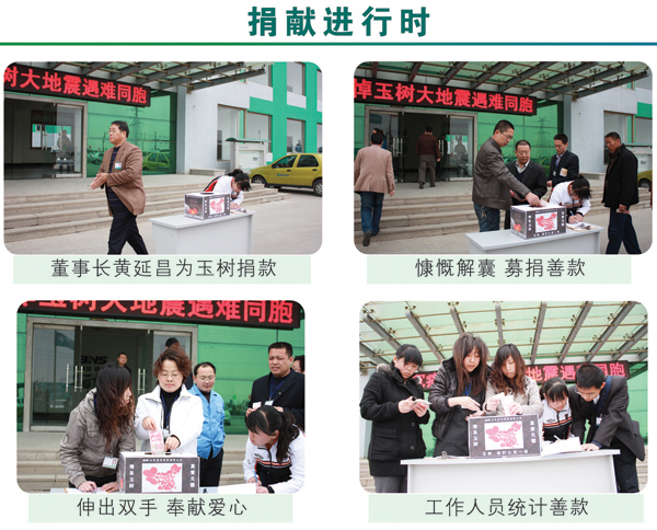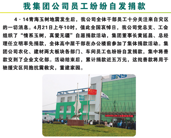 4·14青海玉樹地震發(fā)生后,我公司全體干部員工十分關(guān)注來自災(zāi)區(qū)的一切消息。2010年4月21日上午10時,值此全國哀悼日,我公司黨總支、工會組織了“情系玉樹,真愛無疆”自愿捐款活動,集團董事長黃延昌、總經(jīng)理任立明率先捐款,全體高中層干部在辦公樓前參加了集體捐款活動。集團公司農(nóng)化、建材兩大板塊各部門、車間員工也紛紛自發(fā)捐款,集中將善款交到了企業(yè)文化部。活動結(jié)束后,累計捐款近五萬元,這批善款將用于馳援災(zāi)區(qū)同胞抗震救災(zāi),重建家園。